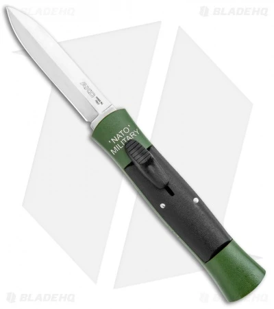 This model has a satin finished, dagger blade and a NATO military green aluminum handle with a black insert.