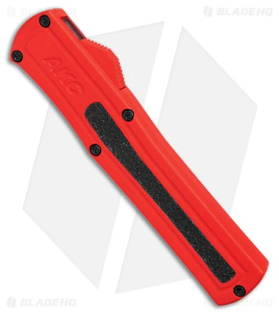 The AKC F-20 is a lightweight, mid-size OTF automatic knife from the Italian company AKC. These knives are made from aluminum with a sandpaper inlay for grip. The dual-action thumb slide has jimping for texture. The firing action is satisfying and powerful! This is a lot of knife for the price!