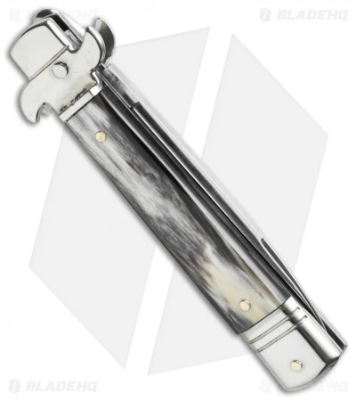 This 7.5″ Italian Stiletto from AKC comes in the Leverletto style with a Brazilian horn handle and a flat grind blade with a partially serrated edge. AKC specializes in collectible Italian stilettos made with traditional knife-making techniques. This Bill DeShiv’s designed Leverletto model has a Brazilian horn handle with a stainless steel bolster. Brass pins add a classic finishing touch to the design. The blade comes in a drop point style with a plain edge and a satin finish. Add classic Italian style to your collection with the AKC 7.5″ Leverletto stiletto.